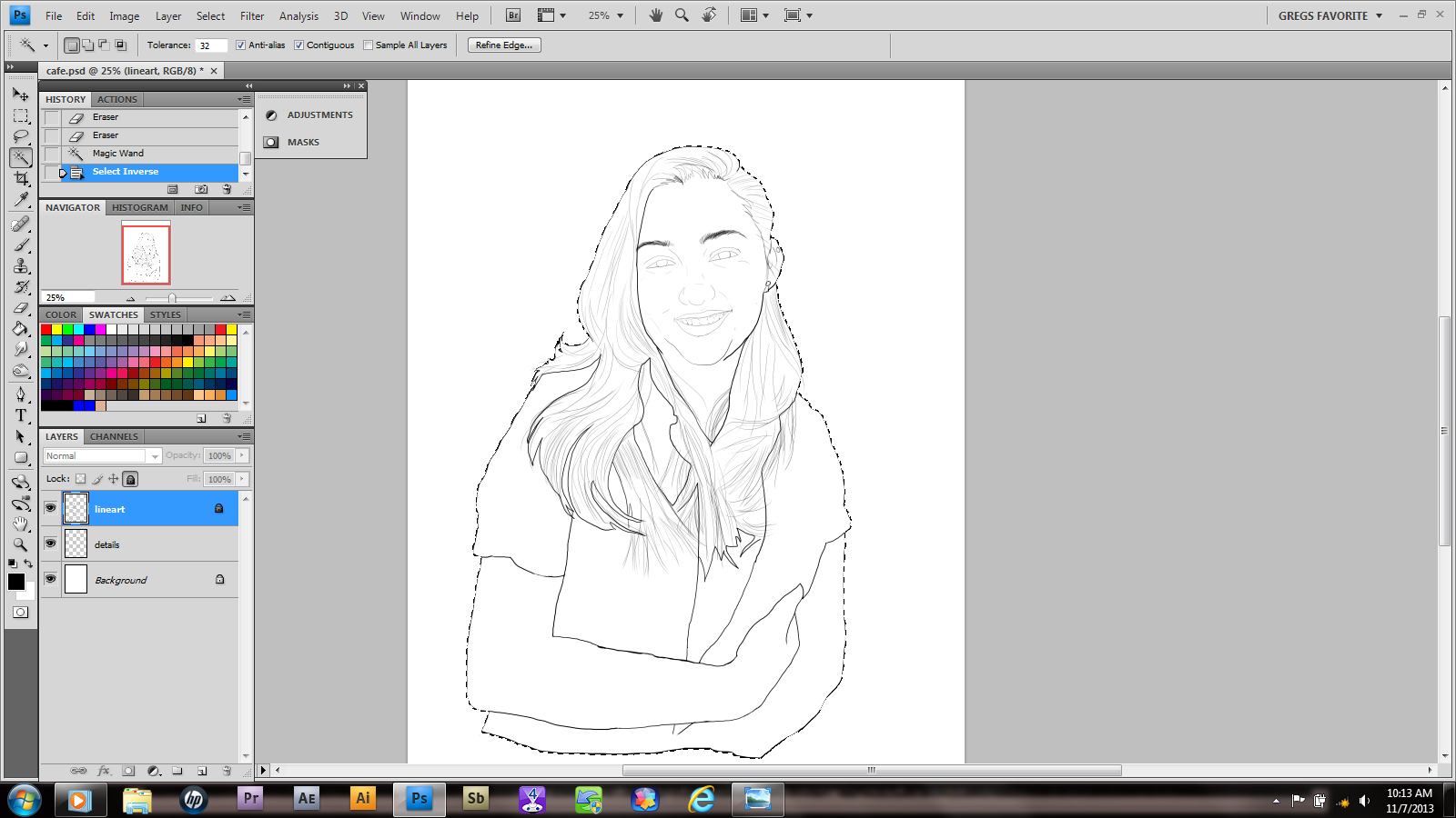 Now return to the original project. After creating another layer under the linework, paste or Ctrl+V the selection onto this layer. I used the move tool to align it, as well as a second layer to cover the area under her arm. I merged them by right-clicking the layer and selecting merge layers FOR THOSE TWO ONLY. I decided to leave the line levels darker than the surrounding line work. Lowering the opacity would have matched it perfectly, but I want the clothing to have a different texture from the person. So I merged it with the linework and locked that layer.