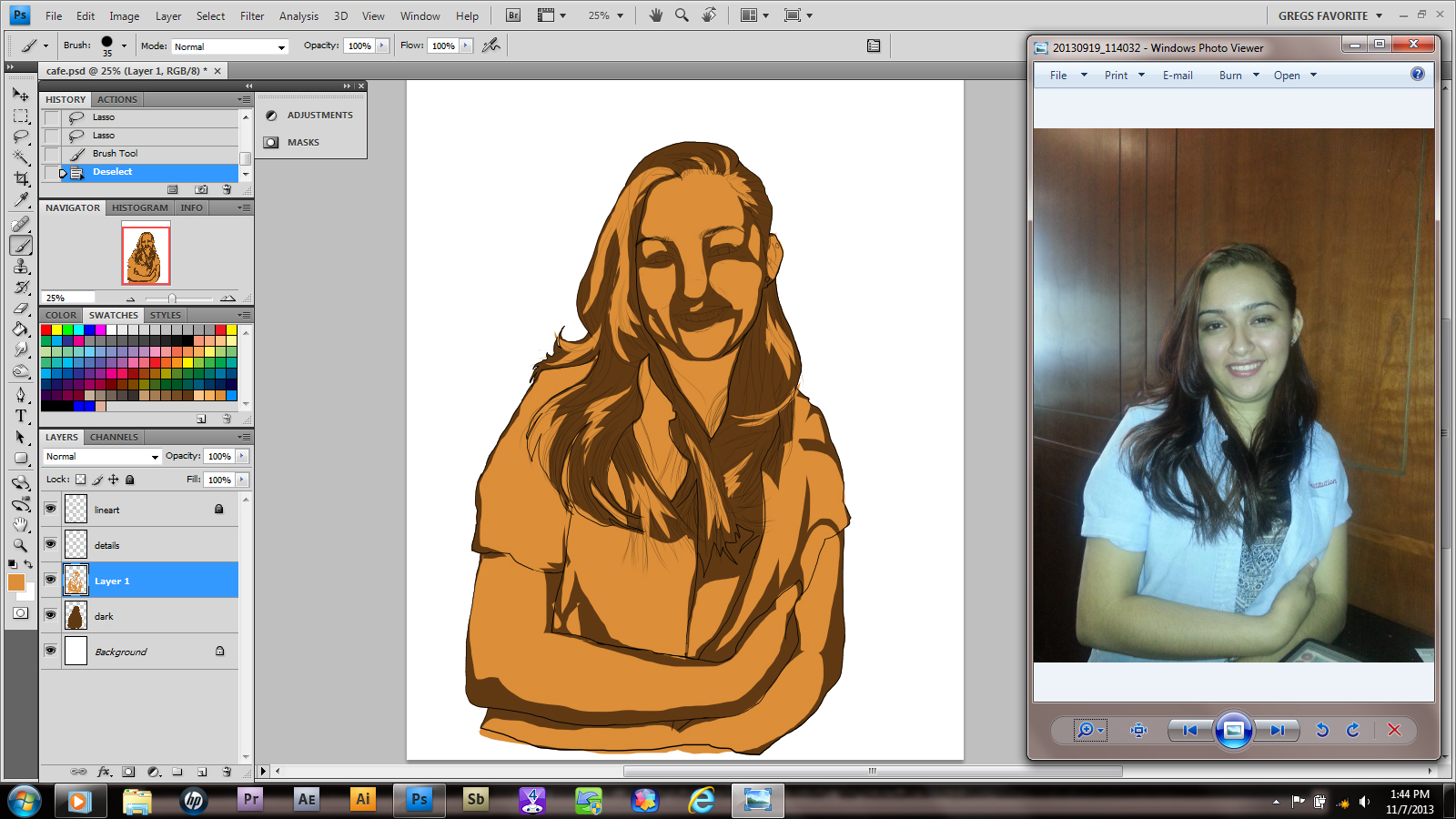 A detail of the picture was bothering me. Her shoulder was sticking out and because the shirt is a little large on her, she had a Quasimodo look to her. This girl is way too cute for that! Luckily I had more than one photo of her. Remember, reference material is important! I used to believe that “real” artists didn’t need any of that crap, that it was like cheating. So the lesson here is don’t be a dumbass like I was!