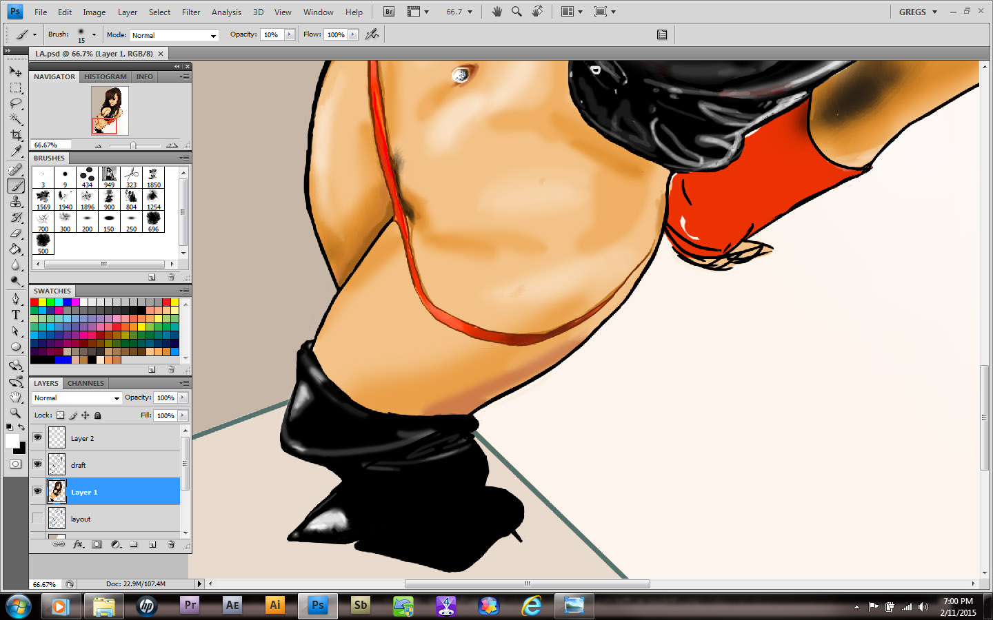 I spent most of this morning correcting the line art and making a scrumptious crotch for this image. It wasn’t hard actually. Even though most of the work went easily enough, I still have a hard time giving her a good background.