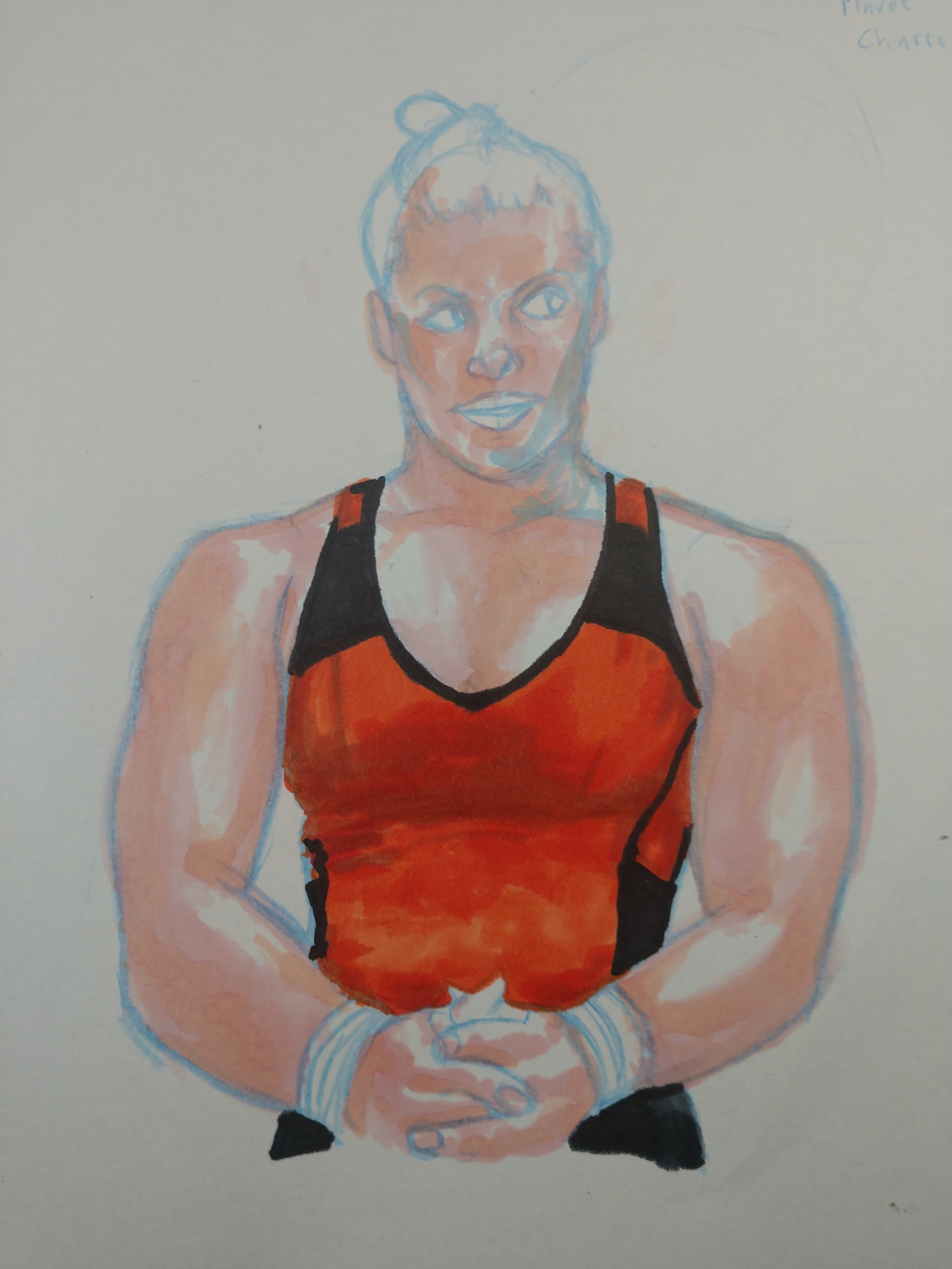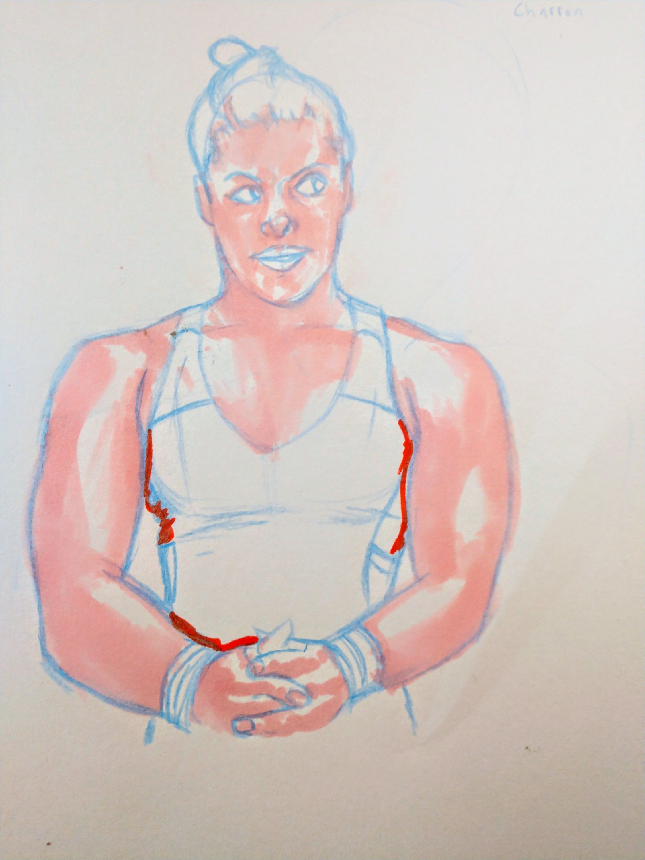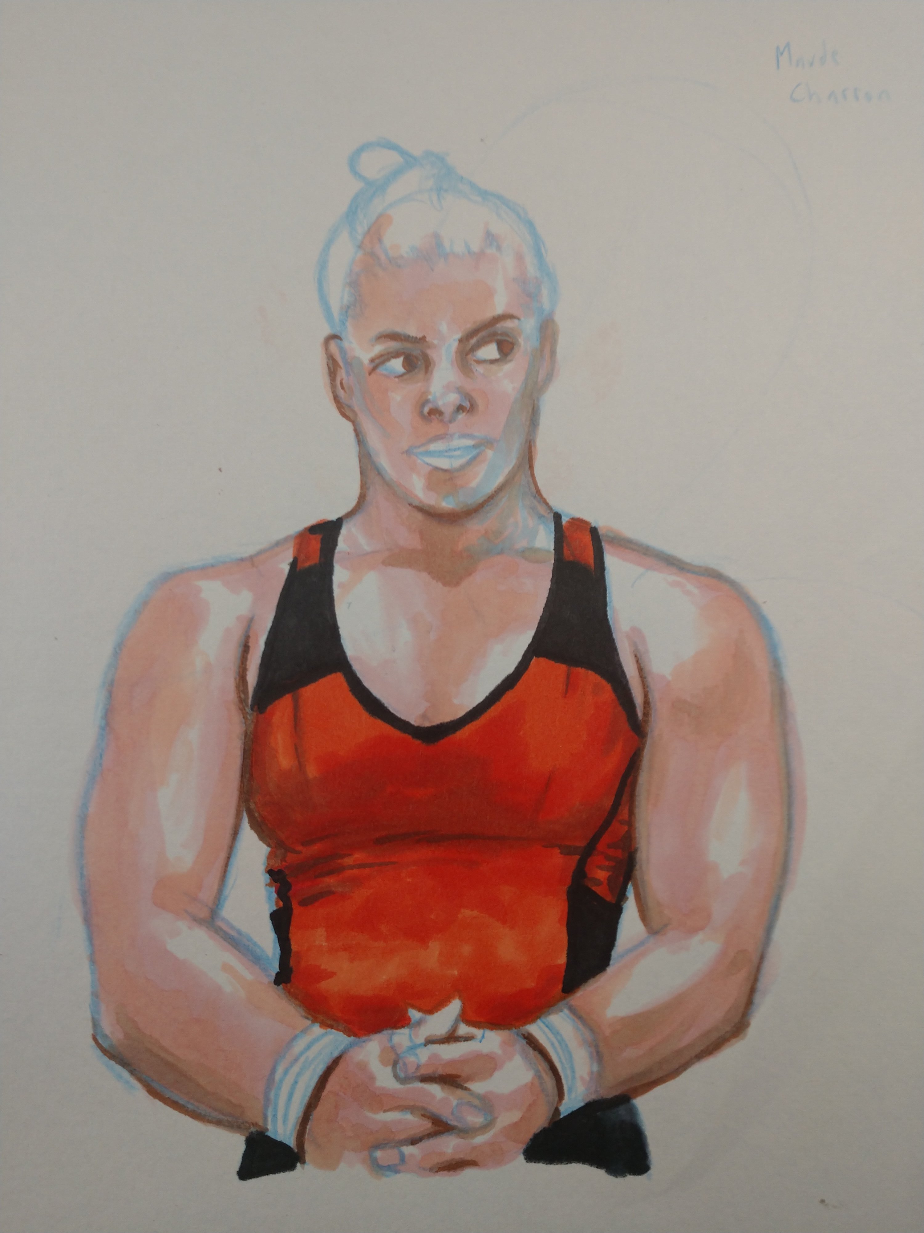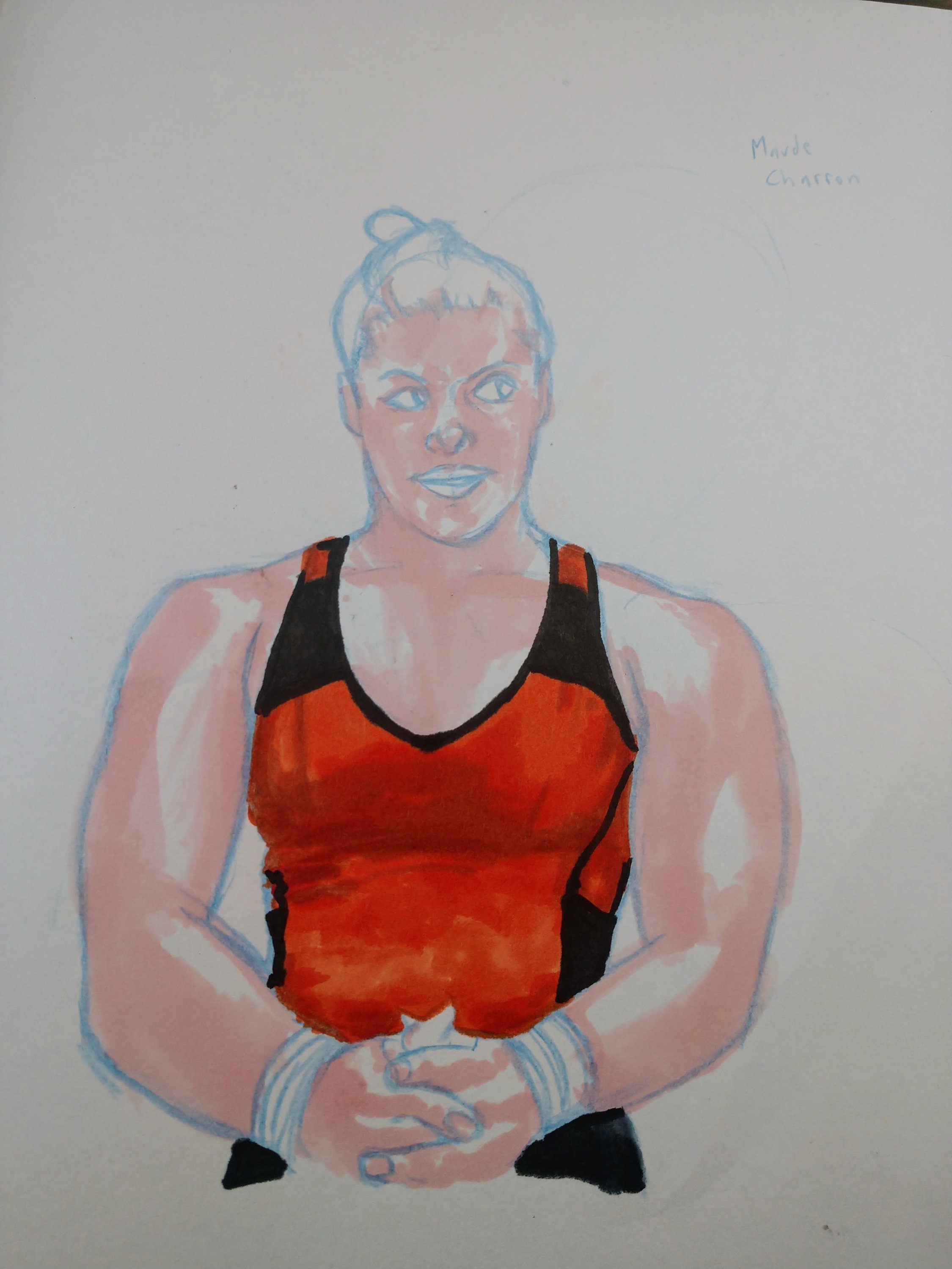 Meet #maudecharron. She’s a pretty cool powerlifter. After watching her at an international meet, I felt the urge to draw her. Her expression tells a story. She was about to go for her second clean and jerk and while chalking up she shot the weights a defiant look. Now you have to understand; up until this point she had been a ray of sunshine. She almost danced with glee on the platform for her first lift. She was so energetic and upbeat that I was happy for her. But her demeanor changed here. You could tell that she felt that this would be a challenge, but her confidence in herself was unwavering. I love that about athletes. It’s a confidence borne of achievement. “I can because I have”. Of course she made the lift. And her playful excitement returned, but I CV had seen the steel and conviction behind her grace. So I drew her. Right at that moment when she decided that she would succeed, no matter what. Look at that expression. You almost feel sorry for those weights.