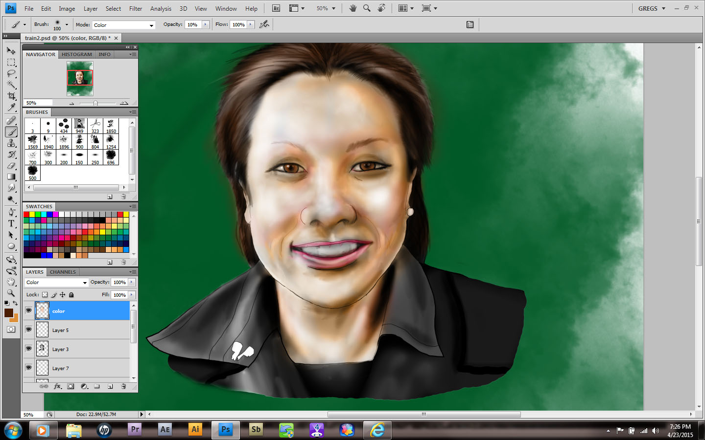 Today I took a cloud brush and stamped in some green clouds. Why? Hell if I know! Just kidding. I actually have an idea kind of bouncing around in my skull. After that I create another layer and use the selection tool
