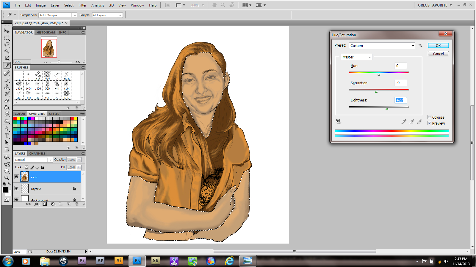 As you can see from the above photo, I pretty much got everything the way I wanted in the photo. Now I merge all my shading layers down into one layer. Then, using the lasso tool, I outlined all my skin tones. Finally, I use Ctrl+U to get my saturation tool to adjust skin color. Make sure you select the colorize box!