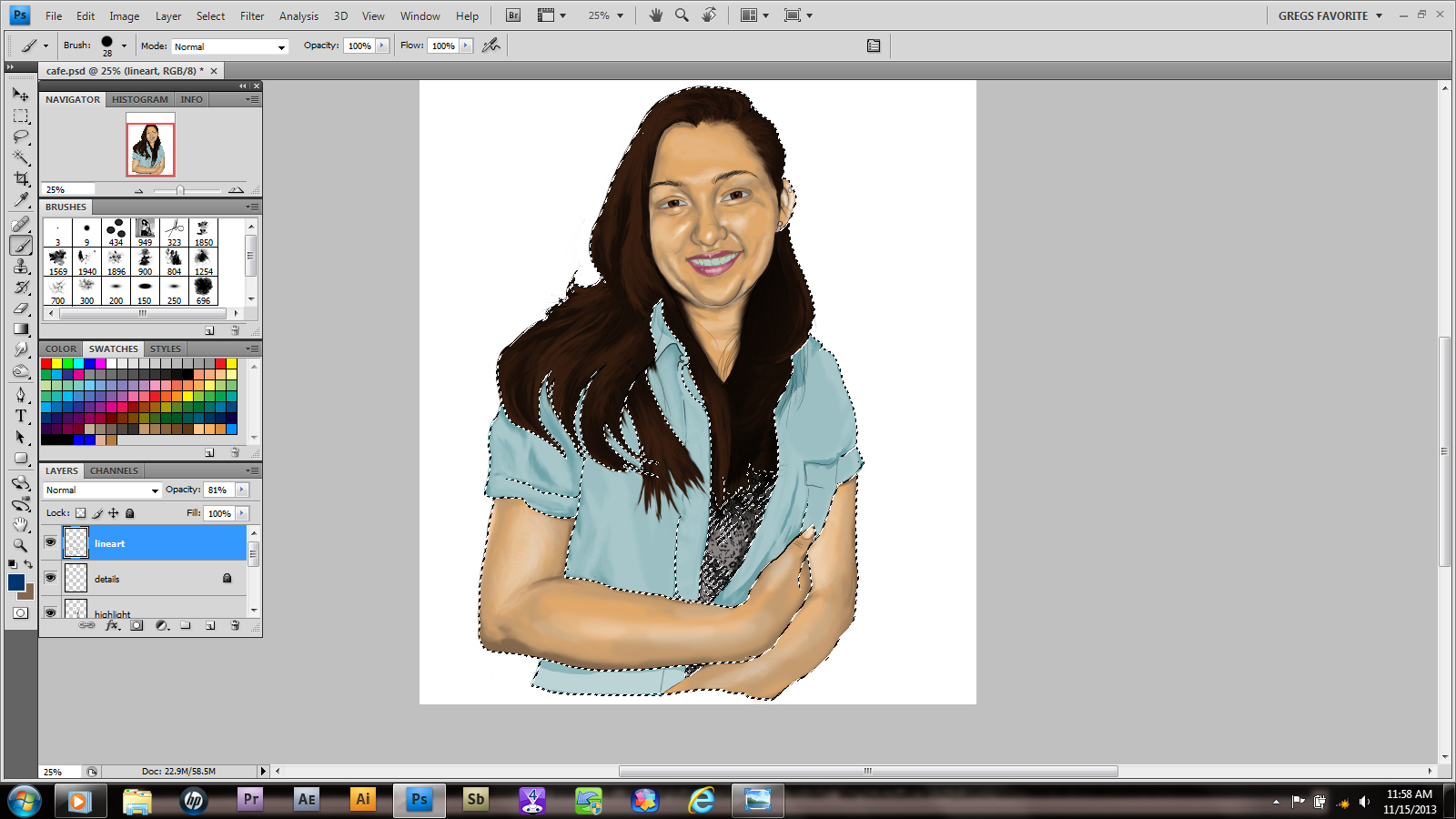 Now return to the original project. After creating another layer under the linework, paste or Ctrl+V the selection onto this layer. I used the move tool to align it, as well as a second layer to cover the area under her arm. I merged them by right-clicking the layer and selecting merge layers FOR THOSE TWO ONLY. I decided to leave the line levels darker than the surrounding line work. Lowering the opacity would have matched it perfectly, but I want the clothing to have a different texture from the person. So I merged it with the linework and locked that layer.